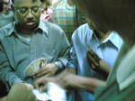 Up Shantipur of 17.50( the shyamnagar special) The original group consisted of mostly the same players from the original 9.50 shantipur. Bholada,Jayantada et al. Often Aloke Mukherjee used to come.Later myself & Ranjan Banerjee joined. But the group broke as Tanayda(Ranesh Bhat-chaz-- a true communist who sacrificed many a things for the achievement of many a things) forced Bholada to shift from 2/2 to 2/3( code language to denote compartment/door position in a train). Tanayda & Palanda(more & more of him under seperate header) joined with sujitda.Biswasda,hitherto a kibitzer,also joined when tanayda detached himself. Khokada,a rare gentleman(grandson of Panu Mukhujjey,one of the original residents of shyamnagar/Rahuta) seldom gets chance to play. Then there is Asimda. Another favourite for Biswasda for his evening tiffin. When Gangada retired, the other ground was auctioned.Shibeda,Tulsida,& others left.But the man in the picture overleaf took up position here.In the recent past,Tulsida has taken membership.